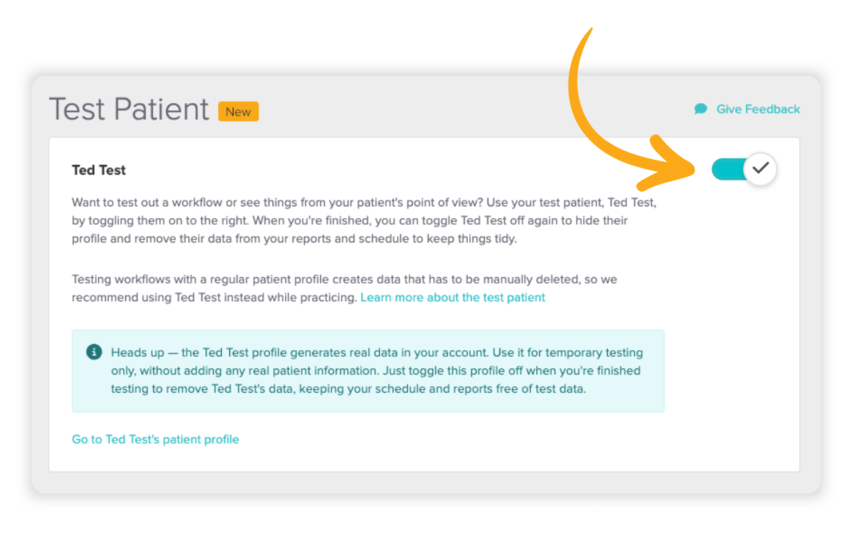 Introducing Ted Test, your new default test patient you can turn on then off — and undo all the changes you’ve made from testing — right in your own account. 👋