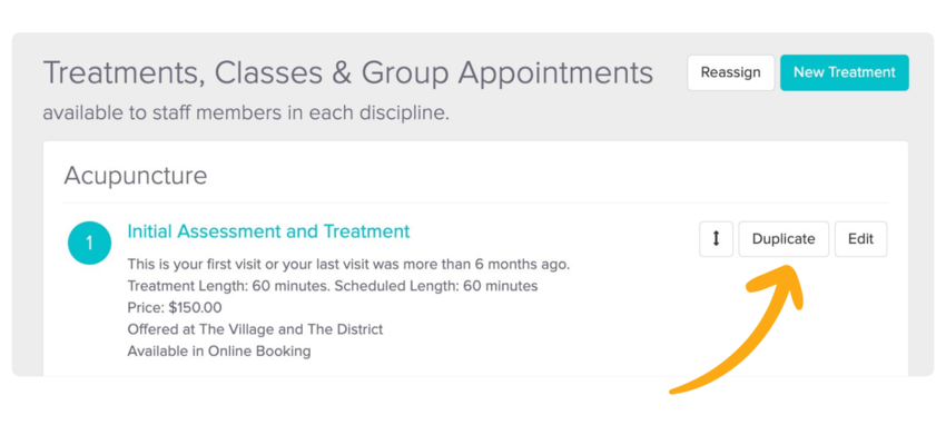 Try it out by heading to Settings > Treatments, Classes & Group Appointments, and clicking the Duplicate button next to the treatment you’d like to copy.