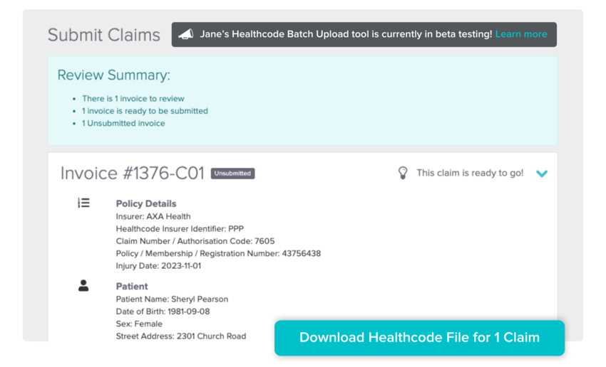 With our new Healthcode Batch Upload tool in open beta, you can now download a batch submission file **from Jane that can be uploaded to your Healthcode portal. The goal of this tool is to help you get paid faster by providing a simpler, more secure way to submit to Healthcode.