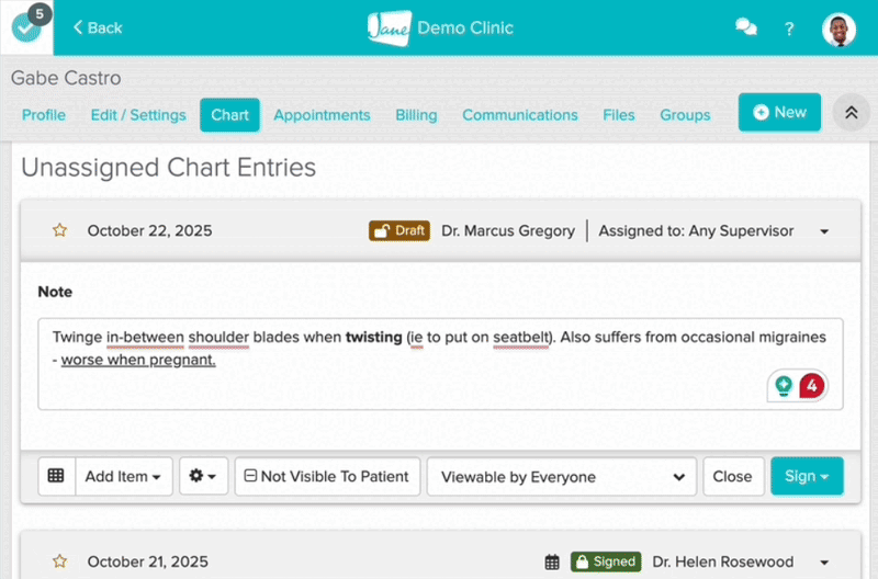 This week, we’re starting to roll out something called AI Scribe Free. It’s an easy, no-pressure way to see how Jane’s integrated AI can help with your charting. Starting this week, you’ll find AI Scribe in your charts, and you can get started by asking your Account Owner for access.