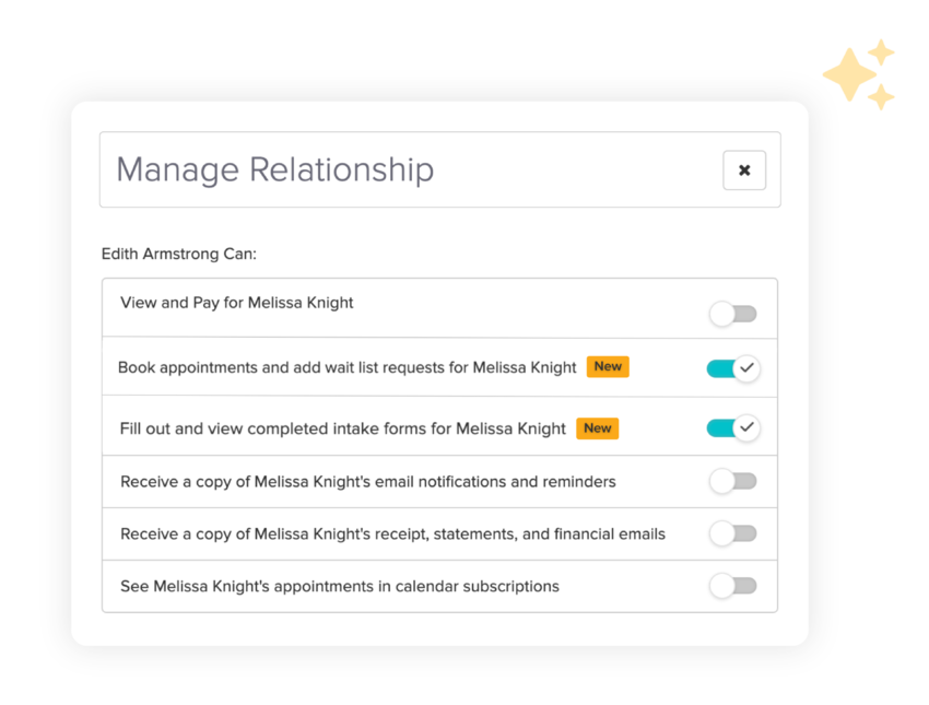 It can be nice for related members to book appointments on each other’s behalf. That doesn’t always mean they want that person to help manage and complete their intake forms though (or vice versa).