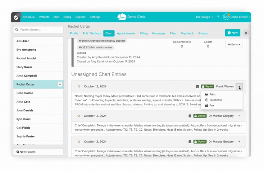 We’re partnering with a cloud-based fax provider, Documo, to let you send outbound faxes directly from your patient’s or client’s chart, and receive faxes through the Documo portal. Anyone with chart access can fax a single chart entry, all entries within a selected date range, or all entries attached to a Treatment Plan — without any downloading or printing!