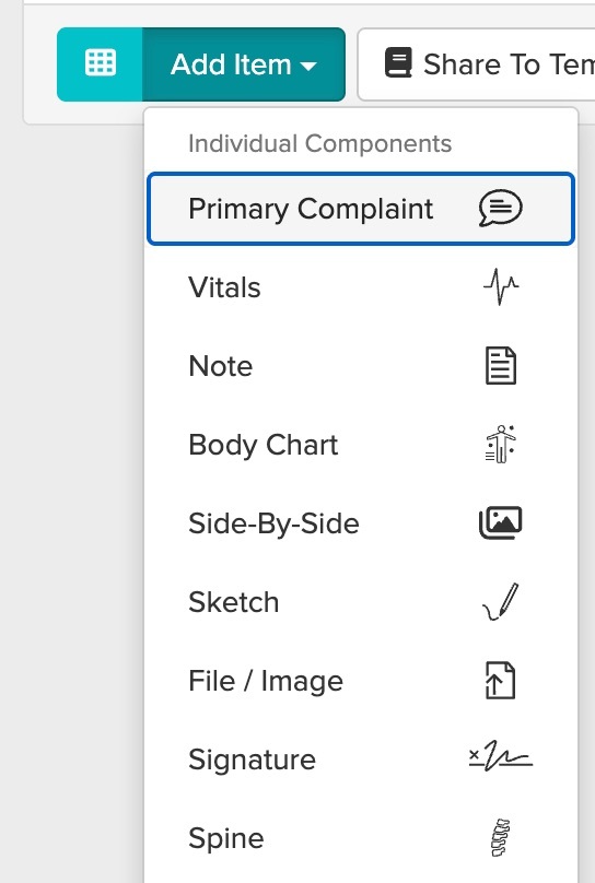 Jane offers a variety of Chart Parts (or items) to help you format and organize your notes—think of them as building blocks. These include options like written notes, images, body charts, and checkboxes. You can also learn all about the different Chart parts available for building your chart templates in this Guide.