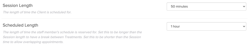 Next up is the Session Length and the Scheduled Length. We often see the scheduled length extended for post session time, to allow for charting or a quick break.