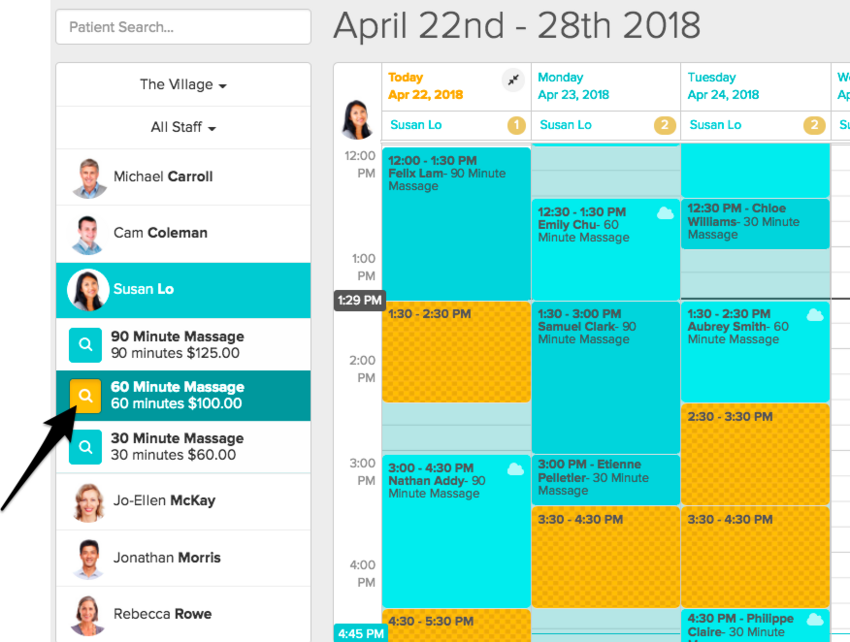 Even if you don’t offer online booking, you can still click the magnifying glass to see suggested slots based on scheduling rules established by individual staff and clinic settings.