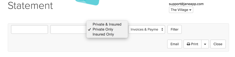 From there you will see some further filters at the top of the Statement - you can choose to show just Patient info, just Insurer info or both. You can also filter to only invoices, only payments or both invoices and payments. Once you’ve set the filters hit the “filter” button to have them come into effect: