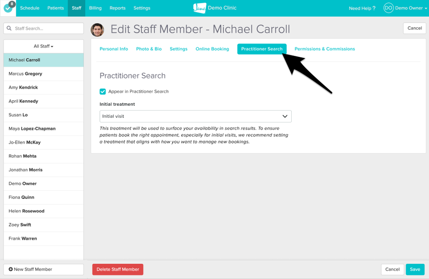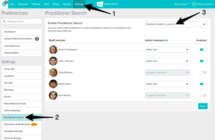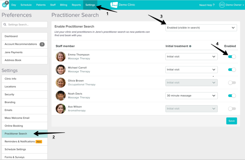 By enabling practitioners, their profile will pop-up in Jane’s Practitioner Search if they have availability bookable online. Don’t forget to click Save once finished!