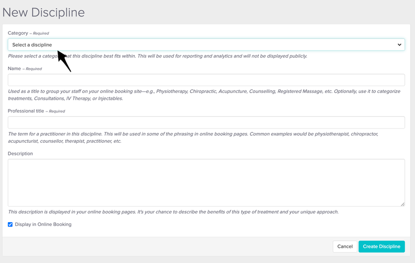 This can be set and edited in your Jane account, under Settings > Disciplines. Jane’s Practitioner Search will utilize the Category to assign practitioners to a discipline.