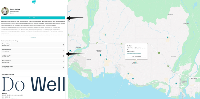 Let’s say you found a practitioner close by who has availability. You can click on their clinic and choose ‘Book with’ or one of the openings displayed to get booked in!