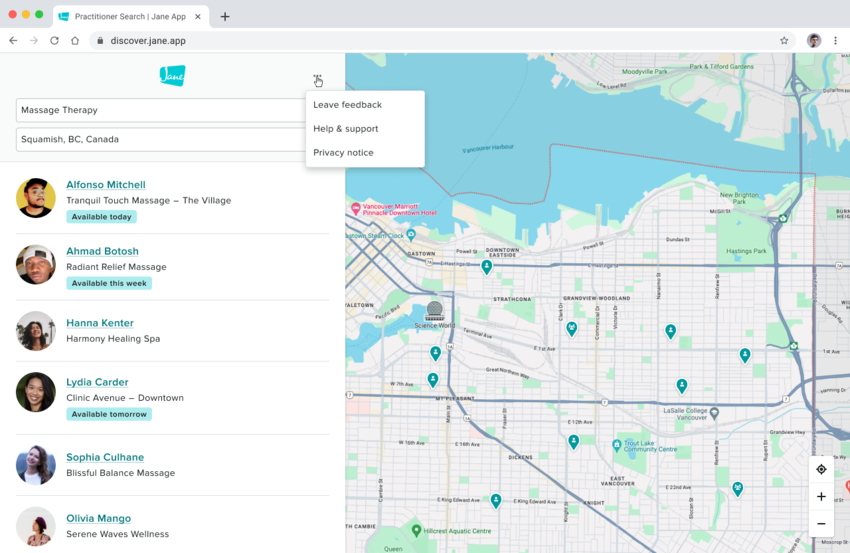 You can also submit feedback via the 3 dots to the right of the Jane logo, when looking for openings in Jane’s Practitioner Search. Open the menu and select “Leave feedback”.