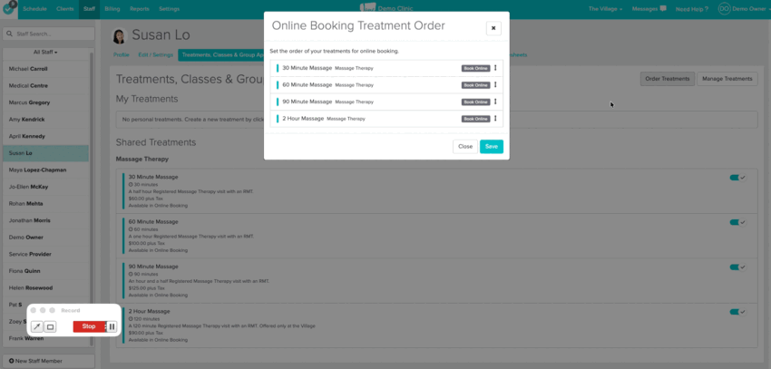 To customize the order treatments display for an individual practitioner head over to their Staff Profile, select Treatments, Classes and Group Appointments and then click on the Order Treatments: