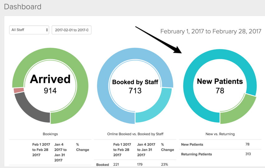 Another option if your looking for just a count of first visits is the dashboard which is the landing page on your Settings tab. If you’re looking to view new patients accross the entire clinic, you’ll need to have Full Access. When run by date range this will show you the number of arrived first visits.
