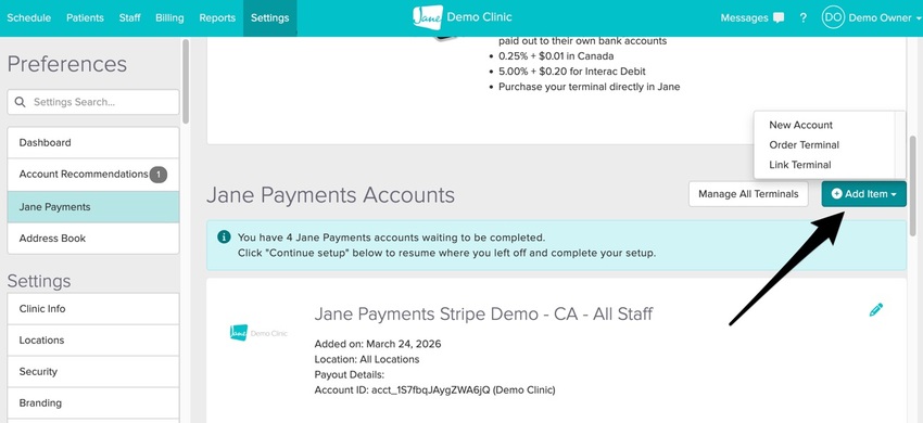 First, you’ll want to head to the Settings > Jane Payments area of your Jane account, and click on the + Add Item button. You’ll then select New Account.