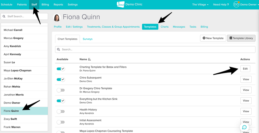 Select Staff > Your Staff Profile. Click on Templates and Edit the existing template you want to update.