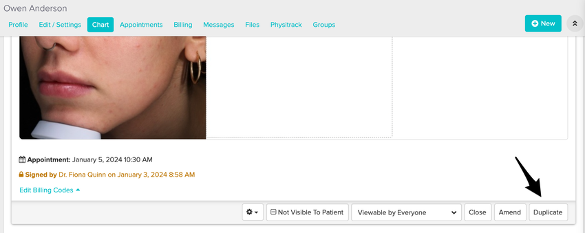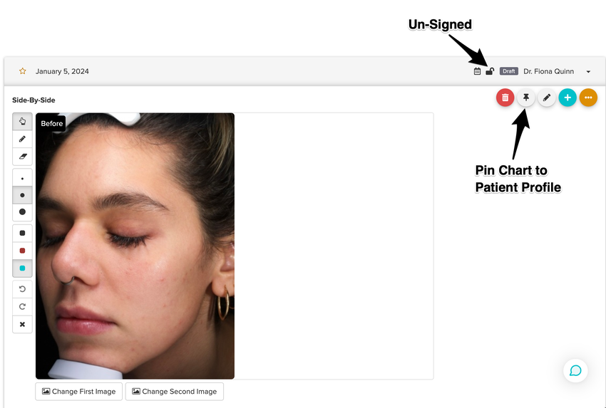 If you want to sign the chart with the original photo right away, you can opt to Duplicate the original, or Before, image once you are ready to add the follow-up image. Here’s how you’d do it: first, you’ll Sign Chart, then you pin the chart side-by-side with the Pin feature. And finally, you will Duplicate the pinned entry when you’re ready to add the follow-up (or After) image.