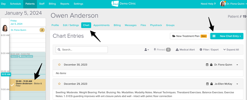 When you select an appointment from your Day tab, Jane automatically opens the client’s charting area.