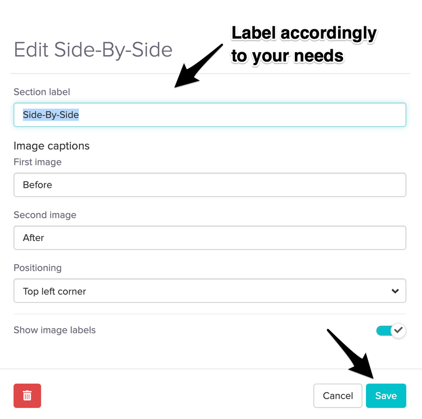 The default labels are “Before” and “After”, but you can change these if you’d like. For example, you might label them “Left” and “Right”. To make adjustments, simply click on the three dots located to the right of the photo and then select the pencil icon.