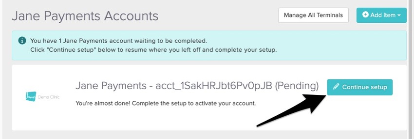 Need to pause your setup? Click Return to settings in the upper-right corner to save your progress. When you’re ready to continue, head back to Settings > Jane Payments and click Continue Setup.