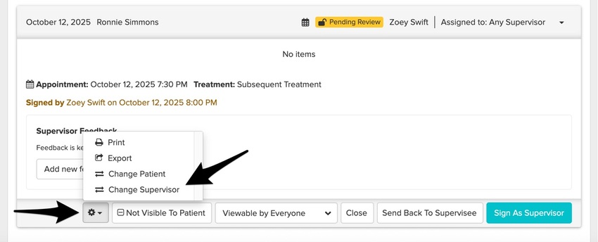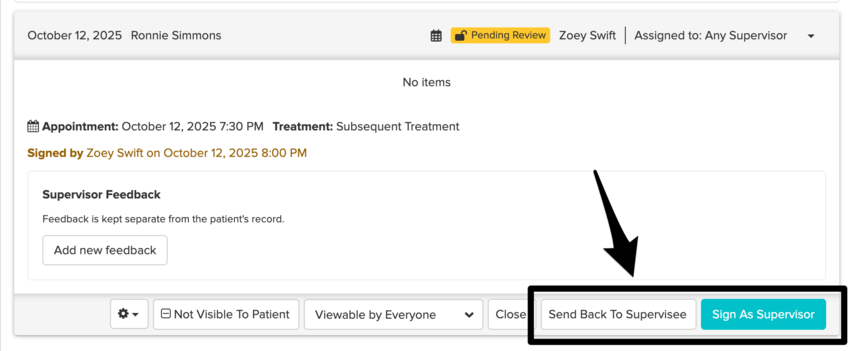 If no action is needed based on your feedback, you can sign off on the chart. Or, you can send the chart back to your supervisee if they need to make some edits.
