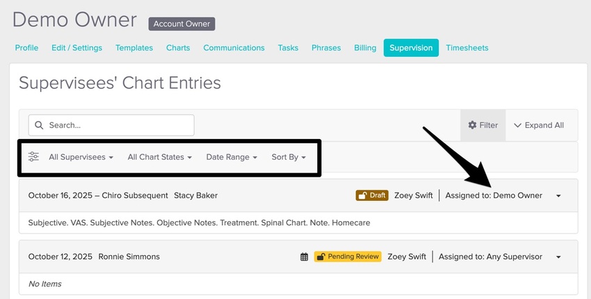 You’ll see some filtering options, along with details about whether a chart is assigned to a specific supervisor or to any supervisor connected to that supervisee.