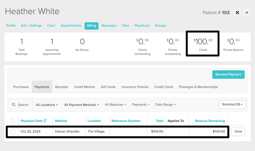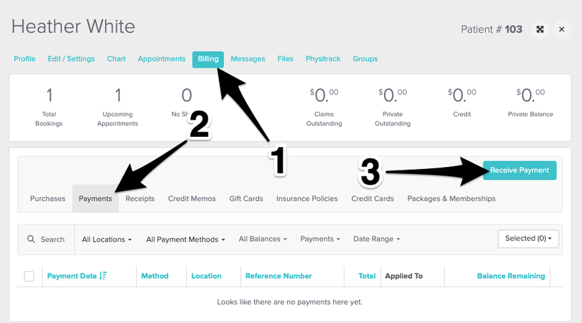 To take a pre-payment, start by navigating to the client’s profile and clicking on their Billing tab. Head to Payments and select Receive Payment to open the Receive Payment panel.
