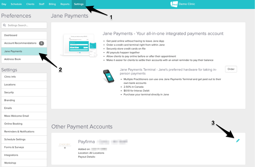 In Jane, go to: Settings → Jane Payments → Payfirma → Pencil icon