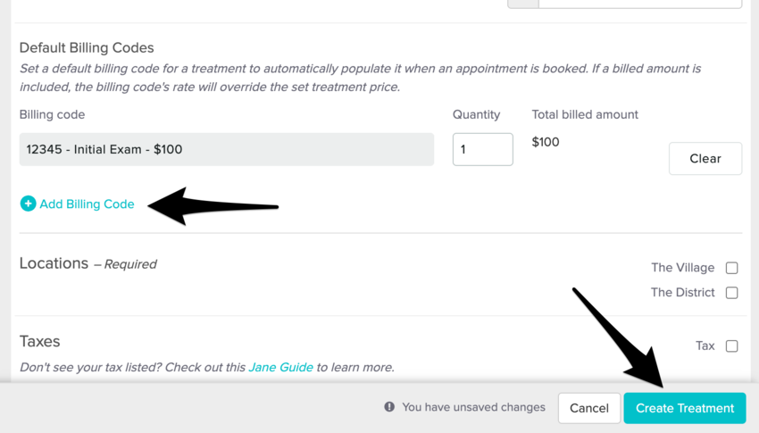 If you switch to a different treatment after the appointment is booked, Jane won’t automatically pull in the new treatment’s default code. You’ll need to update the billing code on the appointment manually if needed.