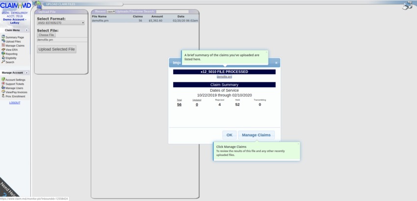 A summary of the claims you’ve uploaded will now be listed here. Click the Manage Claims button to review your uploaded files.