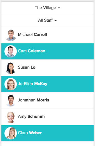 This list shows all practitioners for a particular clinic location. Practitioners currently being displayed in the schedule are highlighted in blue.