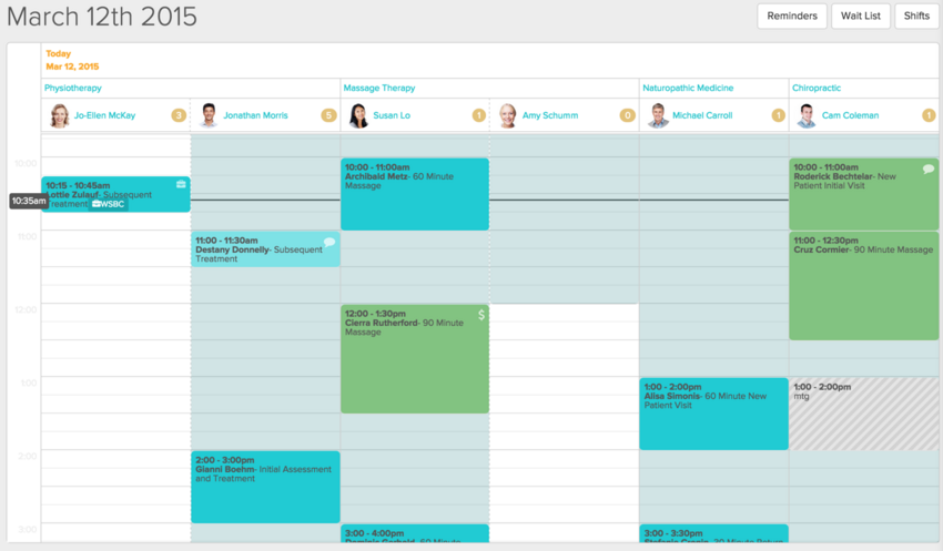 The Staff Today button is the quickest way to see which practitioners have appointments today. Clicking it brings you to the current day’s calendar, with a separate column for each practitioner with appointments booked, a shift scheduled or a break.